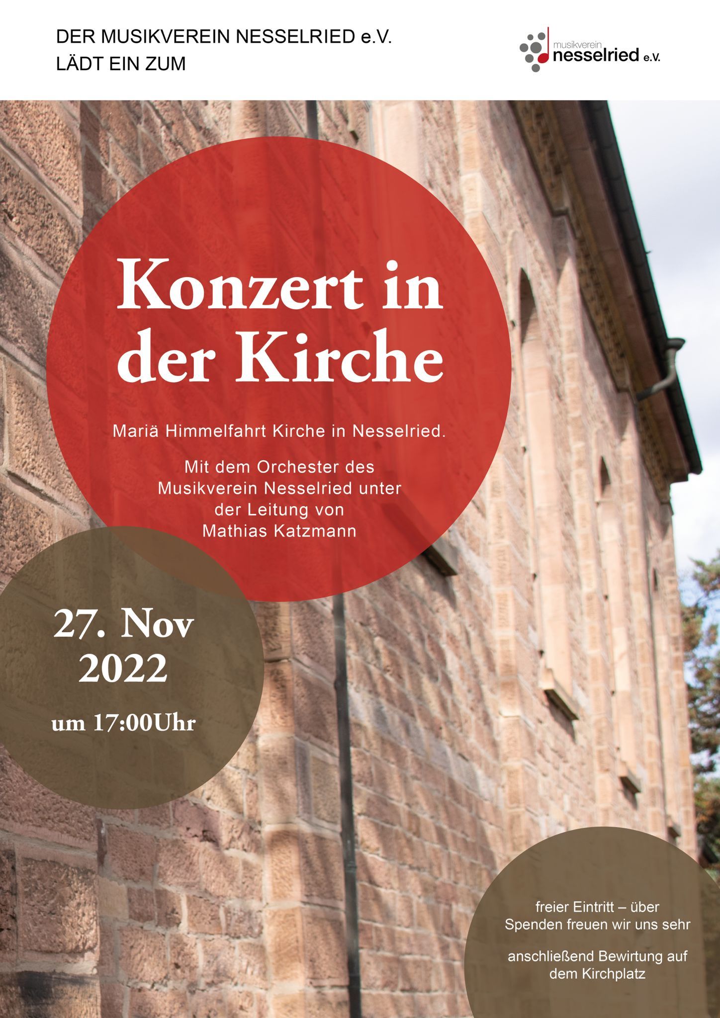 Der Musikverein Nesselried e.V. lädt am Sonntag, 27. No vember 2022 um 17 Uhr zum Konzert in der Kirche Mariä Himmelfahrt in Nesselried ein. Unter der Leitung des Dirigenten Mathias Katzmann wird sie das Orchester mit besinnlicher Musik auf die Adventszeit einstimmen. Der Eintritt ist frei, über eine Spende freuen wir uns sehr. Nach dem Konzert haben sie die Möglichkeit auf dem Kirchplatz in geselliger Runde mit einem guten Tropfen zu verweilen. Auf ihr Kommen freut sich der Musikverein Nesselried